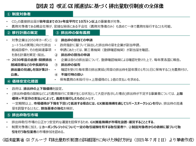 日本の排出量取引制度である「GX-ETS」は2026年度以降、CO2の直接排出量(Scope1)が10万トン以上の事業者を対象に義務化されます。現在、その詳細設計の検討が進んでおり、2025年7月に、経済産業省は算定方法や不履行時の罰則、今後の検討の進め方等について、より踏み込んだ情報を公表しました(図表2参照)。