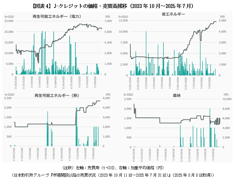 こうした需要の高まりは、J-クレジットの価格の上昇からも推察できます。東京証券取引所のカーボンクレジット市場のデータによれば、直近のJ-クレジットの価格上昇がみられます(図表4参照)。例えば、最も取引量の多い「再生可能エネルギー(電力、図表4左上参照)」では、2024年6月時点では4,200円/t-CO2を下回っていたのに対し、直近の2025年6月時点では5,600円/t-CO2を上回っています。