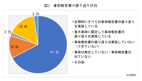 事故報告書の振り返りについては、提出された事故報告書のすべてを対象に実施しているケースと、重大事故に限定して実施するケースが想定されますが、調査の結果、回答者の70%弱の施設が「提出された事故報告書のすべてについて振り返りを実施している」と回答しました(図2)。