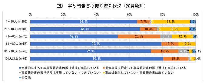 自由記述回答において「小規模で目が行き届いているため、事故は発生していない」とする説明が散見され、実際に定員数が少ないほど「事故は発生していない・事故報告書は出ていない」と回答する割合が増えました(図3)。