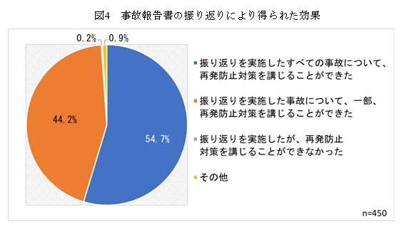 また、事故報告書の振り返りを実施することにより得られた効果について尋ねたところ、「振り返りを実施したすべての事故」もしくは「振り返りを実施した事故の一部について対策を講じることができた」とする回答が多数を占め、多くの施設で一定の再発防止策を講じていることが分かりました(図4)。なお、施設規模による傾向の違いはうかがえませんでした。