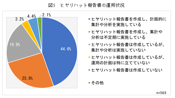 一方、集計や分析は実施しておらず作成のみにとどまっている施設(19.9%)やヒヤリハット報告書自体を作成していない施設(4.4%)も僅かながら見られました。なお、自由記述回答にてヒヤリハット報告書を活用していない理由として、ヒヤリハット報告自体の必要性に疑問を投げかけるコメントも一定見られており、前述したヒヤリハット報告の意義や効果に対する認識が十分でない層の存在がうかがえました。