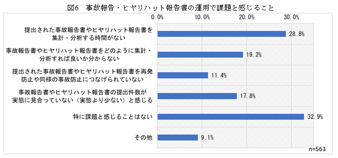 事故報告書およびヒヤリハット報告書の運用上の課題について尋ねたところ「特に課題と感じることはない」(32.9%)とする回答が最も多く、次いで「集計・分析の時間がない」(28.8%)とする回答が多かったです(図6)。