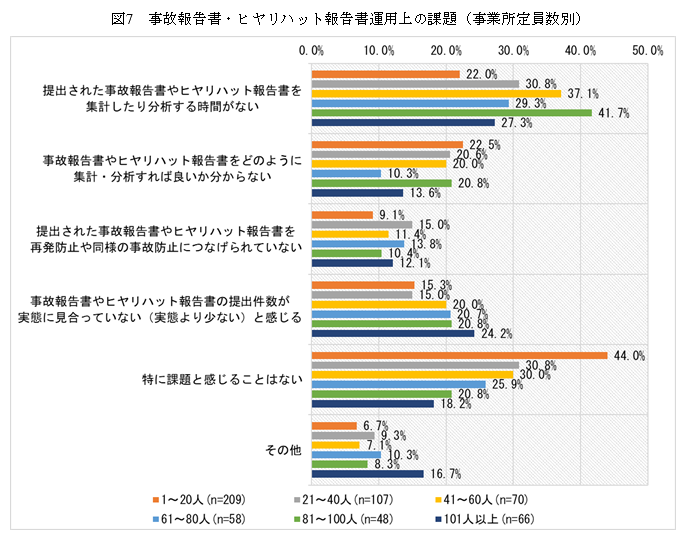 事業所定員数でクロス集計を実施したところ、施設規模が小さいほど「課題はない」と回答する割合が多く、定員21人以上のクラスではいずれも「提出された事故報告書やヒヤリハット報告書を集計したり分析する時間がない」を選択した回答者が最も多かったです(図7※21~40人クラスのみ「特に課題と感じることはない」と同率)。