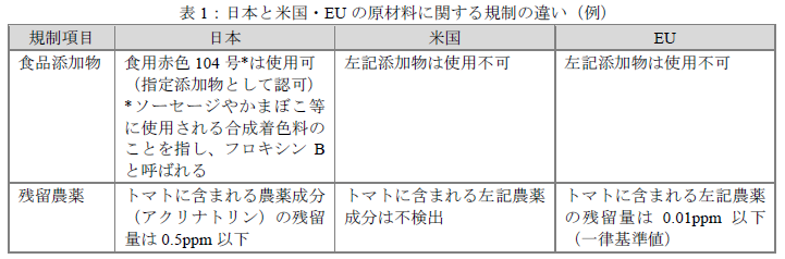 食品添加物は、各国とも「ポジティブリスト制」(許可された添加物以外は使用不可となる制度)ですが、各国でポジティブリストとして指定された食品添加物が異なることに留意が必要です。なお、米国ではネガティブリスト(使用禁止成分リスト)も存在します。