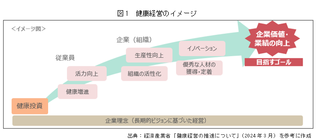 前述の通り、健康経営は、経営課題の解決や改善につなげるアプローチ手法の一つです(図1)。従業員の健康増進や組織の活性化も健康経営の取組を通じて得られる効果ですが、経営的視点で考えたときには、本来のゴールはその先にあるべきと考えます。