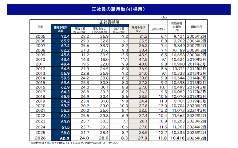 2026年度の正社員雇用では、『採用予定がある』企業が60.3%と3年ぶりに上昇しました。継続する人手不足、退職や高齢化に伴う補充需要の増加が背景にあるほか、事業拡大を見据えた“攻めの採用”の動きもみられました。