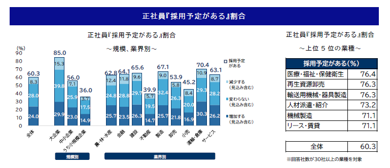 正社員『採用予定がある』割合は 60.3% 3 年ぶりに上昇、 2 年ぶりに 6 割を回復