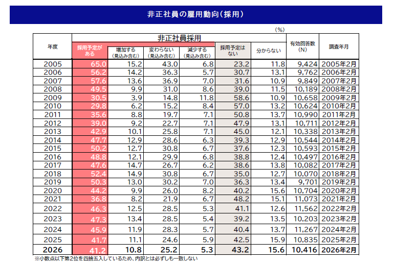 2026 年度の非正社員の採用状況について尋ねたところ、『採用予定がある』(「増加する」「変わらない」「減少する」の合計)企業の割合は前年度比0.5ポイント減の41.2%と3年連続で低下しました。