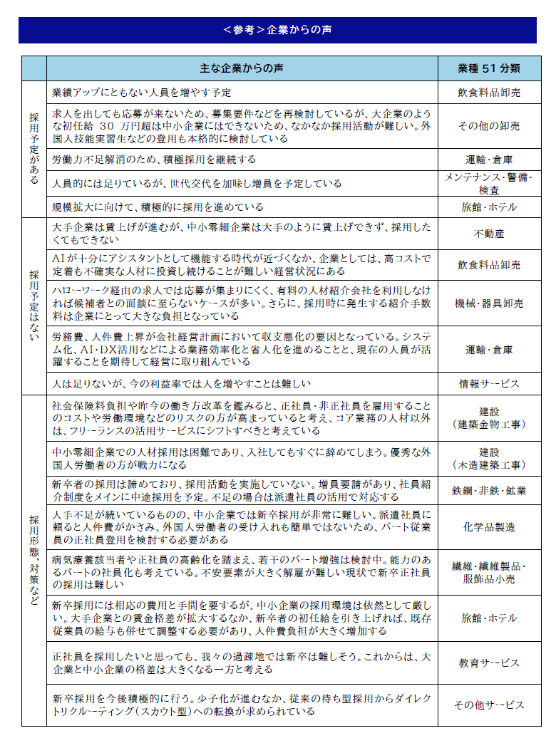 一方で、「採用予定はない」企業からは「売り上げの減少と人件費の高騰により、今いる社員への給与支給を確保するのに精いっぱいで、人員増強を行う余裕がない」(機械・器具卸売)といった、業績悪化や人件費上昇による採用余地の縮小が多く指摘されました。さらに、「現在の人員で業務は十分賄えており、採用の必要性は感じられない」(その他サービス)等、現状維持を理由に採用を控える企業もありました。ほかにも、「採用活動はしているが応募がない。予算がないため外部業者を利用することもできない」(専門サービス)等、採用意欲はあるものの応募が思うように集まらず、実際の採用につながらない企業がみられました。