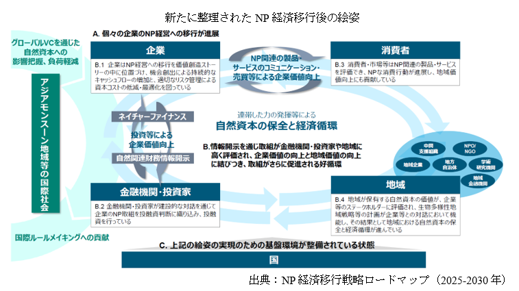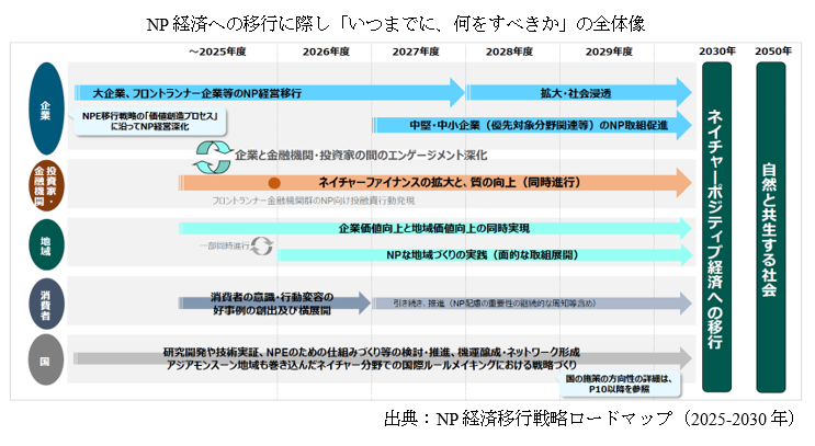 こうした背景から2024年3月に環境省・農林水産省・経済産業省・国土交通省の4省庁連名で「NP経済移行戦略(注1)」を策定しました。同戦略では、NP経営による取組が単なるコストアップではなく、自然資本に根ざした経済の新たな成長につながるチャンスであることが強調され、実践が促されました。