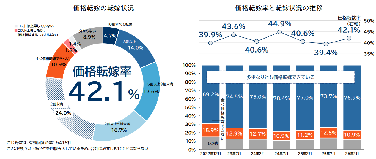 また、コスト上昇分に対する販売価格への転嫁度合いを示す「価格転嫁率(注1)」は42.1%でした。これはコストが100円上昇した場合に42.1円しか販売価格に反映できず、残りの約6割を企業が負担していることを示しています。前回調査(価格転嫁率 39.4%)と比較すると2.7ポイント上昇し、およそ1年ぶりに4割を上回りました。
