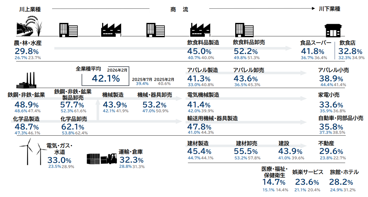 2月調査時点で、企業がコスト上昇を販売価格にどの程度上乗せできたかを示す価格転嫁率は42.1%となりました。4割台を回復したものの、依然として転嫁が進まない企業が少なくないです。川下産業や価格決定権の弱い業種、小規模企業ほど負担が重く、交渉上の立場の弱さも顕著でした。コスト上昇分を企業単独で価格転嫁することには限界が感じられ、取引慣行の見直しや交渉支援、消費者理解の促進が不可欠となっています。