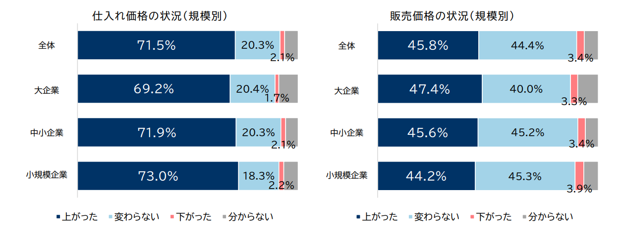 規模別にみると、仕入れ価格が「上がった」とする企業は、企業規模が小さいほどその傾向を強く実感しており、反対に販売価格については、規模が大きい企業ほど「上がった」と捉えていました。