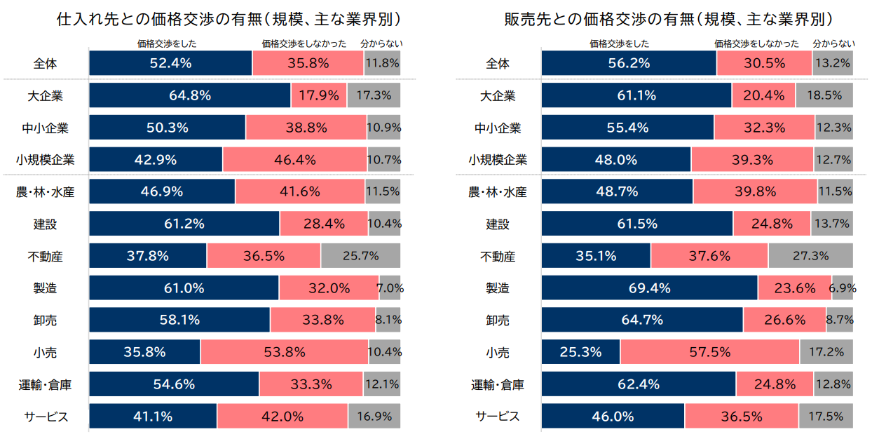 価格交渉の状況について尋ねたところ、仕入れ先と「価格交渉をした」企業は 52.4%、販売先と「価格交渉をした」企業は56.2%でした。価格交渉の有無は規模によって如実に異なり、「小規模企業」における価格交渉の実施割合は、仕入れ先(42.9%)、販売先(48.0%)のいずれも4割台にとどまりました。