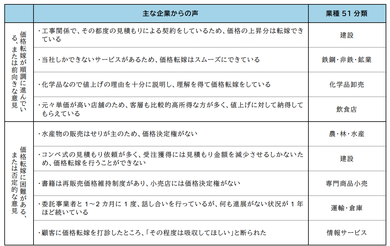 その一方で、価格上昇に対する理解の浸透、代替が利きにくい商品・サービスの保有、強いブランド力等を背景に価格受容性が確保される企業では価格転嫁が円滑に進んでいます。