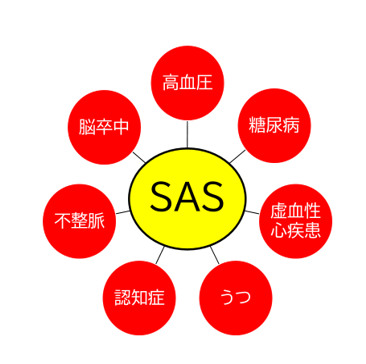 以下の図が示すように、SASは血管、心臓、脳、自律神経等全身におよび、生活習慣病と密接な関係にあります。