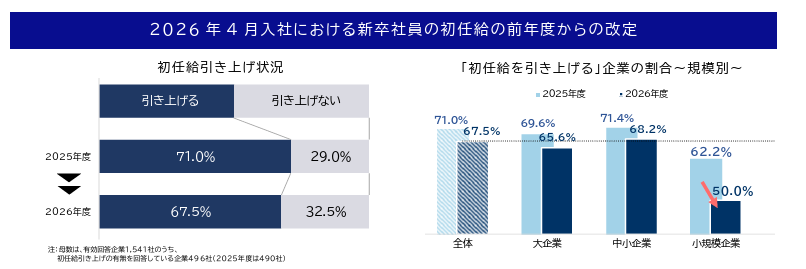 「初任給を引き上げる」と回答した企業の割合を規模別にみると、「大企業」(65.6%、前年度比4.0ポイント減)と「中小企業」(68.2%、同3.2ポイント減)はともに6割台後半でした。一方で、「小規模企業」は同12.2ポイント低下して50.0%にとどまり、全体と比べても17.5ポイント下回るなど、「小規模企業」が取り残される結果となりました。