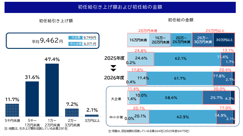 平均引上げ額は9,462円に上昇、「大企業」が「中小企業」を上回る初任給額「25万~30万円未満」は2割近くに