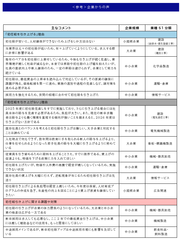 「中小企業」からは、「初任給の引き上げには積極的に取り組みたいが、社会保険料などの負担増に加え、仕入価格など給与以外のコストが上昇している現状では大幅な引き上げは難しい」(飲食料品卸売)といった切実な声が聞かれました。