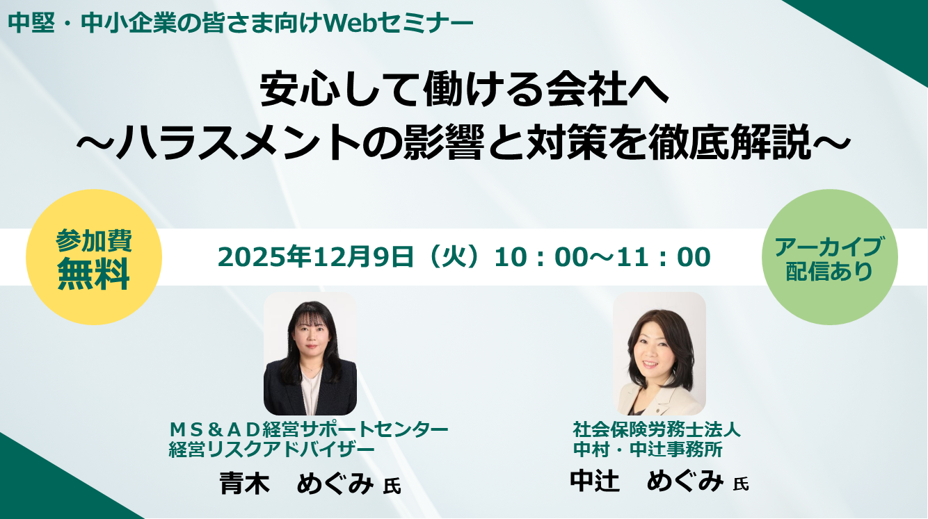 近年、企業におけるハラスメント対策は社会的責任として重要性が増しており、関連法改正に伴い、企業に求められる対応は大きく変化しています。対応を怠れば、法的リスクのみならず、従業員の離職・採用難、企業イメージ低下にもつながりかねません。本セミナーではハラスメントの概要から企業に求められる具体的な対策について解説します。