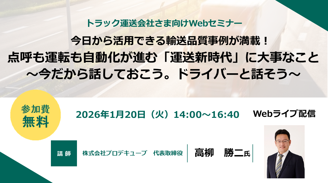 点呼や運転の自動化により物流の効率化が進んでいます。「トラック適正化二法(トラック新法)」で運送事業許可の更新制度などが施行されると、輸送の安全確保など法令遵守が今まで以上に求められ、自動化が難しいドライバーとの会話や人材教育の重要性が更に増すと考えられます。本セミナーでは、トラック運送会社のドライバー/管理者研修を通じた職場作りに多数の実績を有する専門家を講師に招き、「会話」をキーワードとした輸送品質向上のポイントについて、事例を交えながら、分かり易くご説明します。他では聞けない内容ですので、是非ともお申し込みください。