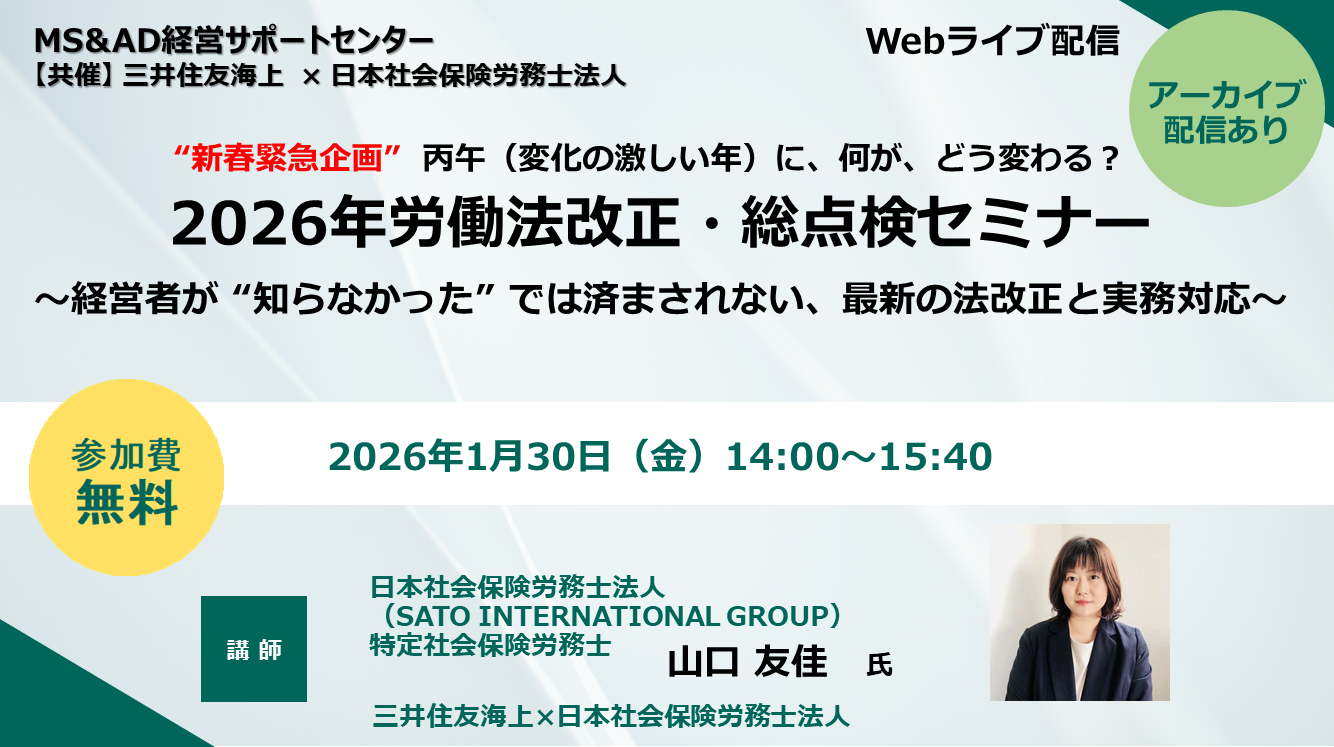 | 主催者情報 | 三井住友海上火災保険株式会社 MS&AD経営サポートセンター 【お問い合わせ先】 三井住友海上火災保険株式会社 地域マーケット部 MS&AD経営サポートセンター Mail:keiei_support★ms-ins.com ※メール送信時は「★」を「@」に変更ください。 |